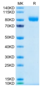 Molecular Mass : | The protein has a predicted MW of 63.5 kDa. Due to glycosylation, the protein migrates to 80-100 kDa based on Tris-Bis PAGE result. |