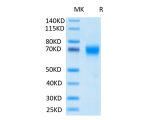 Molecular Mass : | The protein has a predicted MW of 37.7 KDa. Due to glycosylation, the protein migrates to 68- 75KDa based on Bis-Tris PAGE result. |