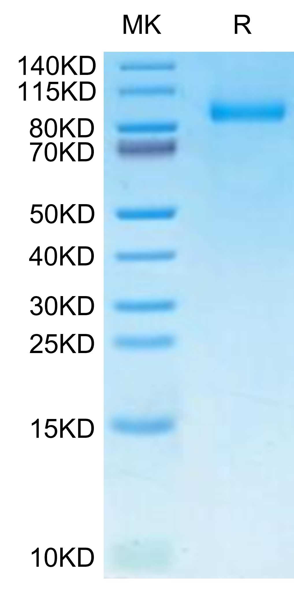 Molecular Mass : | The protein has a predicted MW of 68.29 kDa. Due to glycosylation, the protein migrates to 90-110 kDa based on Tris-Bis PAGE result. |