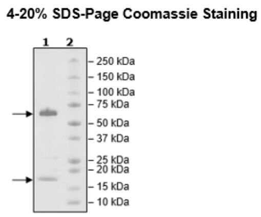 Product Overview : | Recombinant human PCSK9 (proprotein convertase subtilisin/kexin type 9), encompassing amino acids 31-692(end). This construct contains the proprotein PCSK9 at the N-terminal encompassing amino acids 31-152. At the C-terminal this construct contains a His-tag (6×His) followed by an Avi-tag. The recombinant protein was enzymatically biotinylated using the Avi-Tag™ and affinity purified. PCSK9 is autocleaved to the ~14 kDa prodomain (a.a. 31-152) and the ~60 kDa mature form (a.a. 153-692(end)), which run at higher apparent MW by SDS-PAGE. |