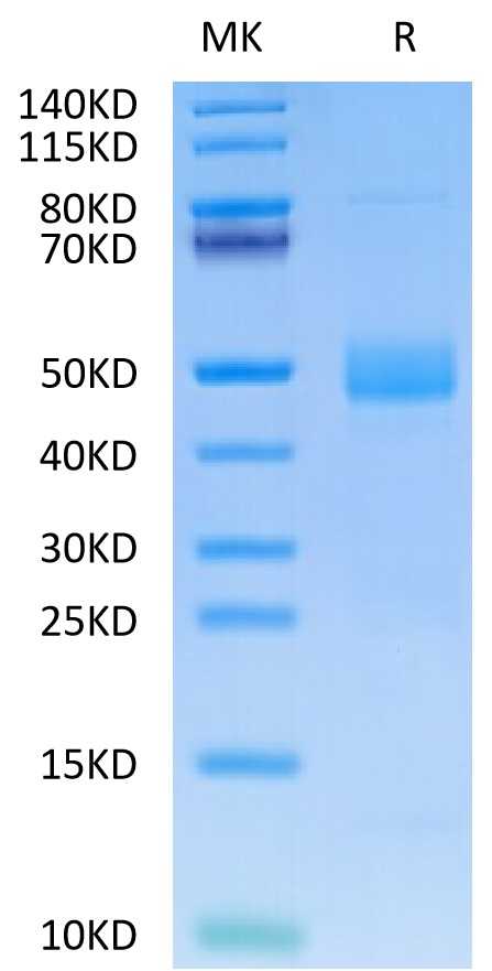 Molecular Mass : | The protein has a predicted MW of 36.56 kDa. Due to glycosylation, the protein migrates to 45-60 kDa based on Tris-Bis PAGE result. |