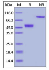 | Molecular Mass : | The protein has a calculated MW of 40.0 kDa. As a result of glycosylation, the protein migrates as 45-55 kDa under reducing (R) condition, and 90 kDa under non-reducing (NR) condition (SDS-PAGE). |