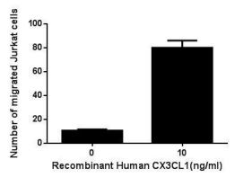 Chemokine C-X3-C-Motif Ligand 1 (CX3CL1) also known as fractalkine is a large cytokine protein of 373 amino acids, it contains multiple domains and is the only known member of the CX3C chemokine family. Soluble CX3CL1 potently chemoattracts T cells and monocytes, while the cell-bound chemokine promotes strong adhesion of leukocytes to activated endothelial cells, where it is primarily expressed. Thus, chemotaxis assay used 24-well microchemotaxis system was undertaken to detect the chemotactic effect of CX3CL1 on the human monocytic cell line THP-1. Briefly, THP-1 cells were seeded into the upper chambers (150uL cell suspension, 10^6 cells/mL in RPMI 1640 with FBS free) and SLC (1ng/mL, 10ng/mL, 100ng/mL and 1000ng/mL diluted separately in serum free RPMI 1640 ) was added in lower chamber with a polycarbonate filter (8um pore size) used to separate the two compartments. After incubation at 37°C with 5% CO2 for 1h, the filter was removed, then cells in low chamber were observed by inverted microscope at low magnification (×100) and the number of migrated cells were counted at high magnification (×400) randomly (five fields for each filter). Result shows CX3CL1 is able to induce migration of THP-1 cells. The migrated Jurkat cells in low chamber at low magnification (×100) were shown. Five fields of each chamber were randomly chosen, and the migrated cells were counted at high magnification (×400). The optimum chemotaxis of CX3CL1 occurs at 1-1000ng/mL. |