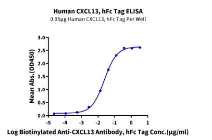 | Bio-activity : | Immobilized Human CXCL13, hFc Tag at 0.5ug/ml (100ul/well) on the plate. Dose response curve for Biotinylated Anti-CXCL13 Antibody, hFc Tag with the EC50 of 23.8ng/ml determined by ELISA. |