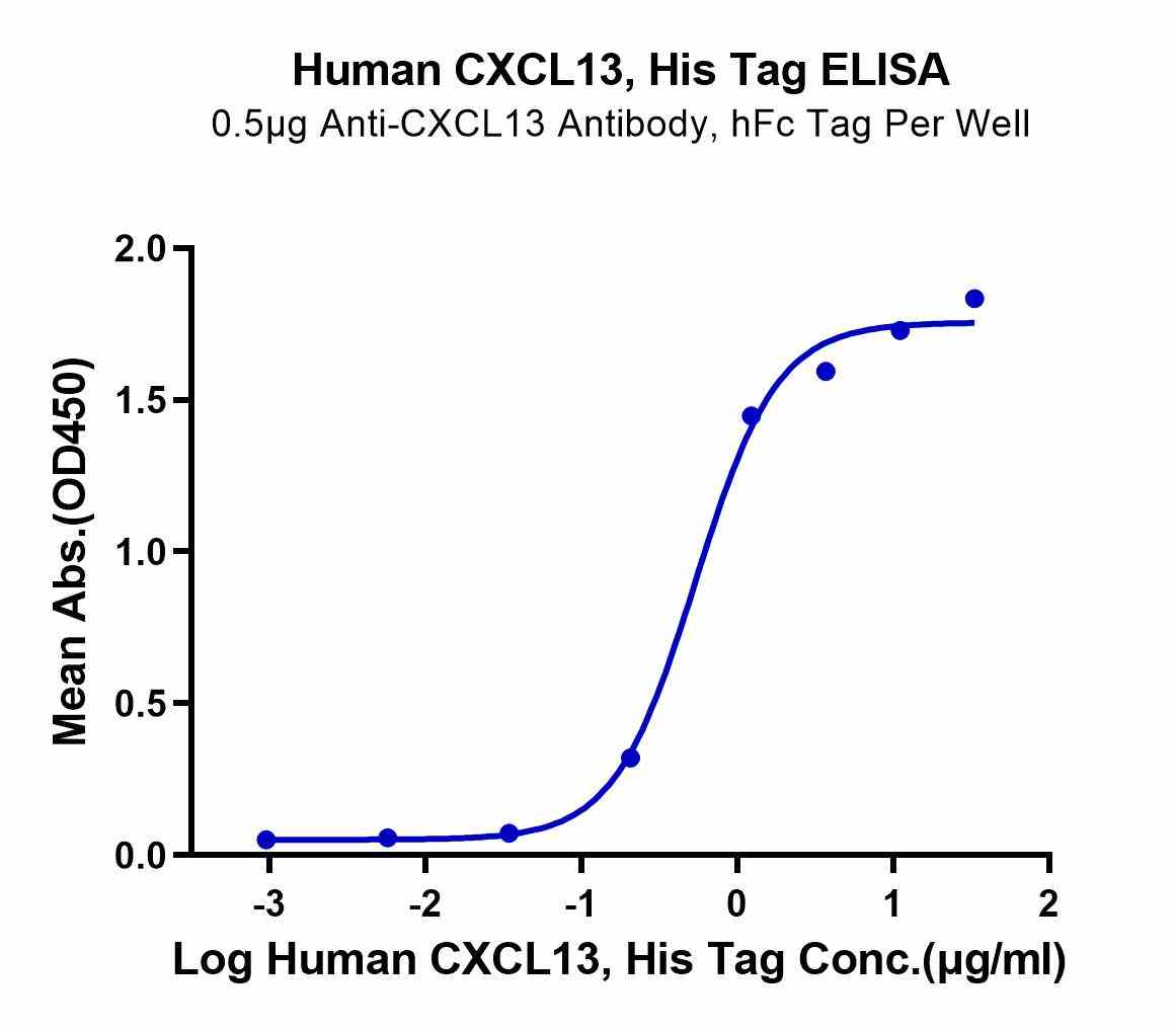 | Bio-activity : | Immobilized Anti-CXCL13 Antibody, hFc Tag at 5μg/ml (100μl/well) on the plate. Dose response curve for Human CXCL13, His Tag with the EC50 of 0.54μg/ml determined by ELISA. |