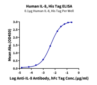 | Bio-activity : | Immobilized Human IL-8, His Tag at 1ug/ml (100ul/well) on the plate. Dose response curve for Anti-IL-8 Antibody, hFc Tag with the EC50 of 4.4ng/ml determined by ELISA. |
