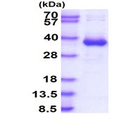 CYB5R3 is a cytochrome b5 reductasecytochrome b5 reductase, which includes a membrane-bound form in somatic cells (anchored in the endoplasmic reticulum, mitochondrial and other membranes) and a soluble form in erythrocytes. The membrane-bound form exists mainly on the cytoplasmic side of the endoplasmic reticulum and functions in desaturation and elongation of fatty acids, in cholesterol biosynthesis, and in drug metabolism. The erythrocyte form is located in a soluble fraction of circulating erythrocytes and is involved in methemoglobin reduction. The membrane-bound form has both membrane-binding and catalytic domains, while the soluble form has only the catalytic domain. Mutations in this gene cause methemoglobinemias. Recombinant human CYB5R3 protein, fused to His-tag at N-terminus, was expressed in E. coli and purified by using conventional chromatography techniques. |
