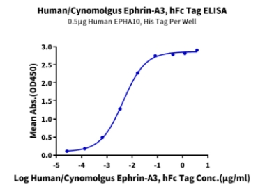Immobilized Human EPHA10, His Tag at 5ug/ml (100ul/well) on the plate. Dose response curve for Human/Cynomolgus EFNA3, hFc Tag with the EC50 of 4.4ng/ml determined by ELISA. |