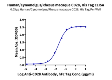 Immobilized Human/Cynomolgus/Rhesus macaque CD28, His Tag at 0.5 μg/ml (100 μl/Well) on the plate. Dose response curve for Anti-CD28 Antibody, hFc Tag with the EC50 of 18.4 ng/ml determined by ELISA. |