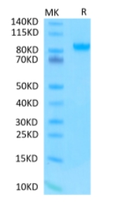 The protein has a predicted MW of 68.8 kDa. Due to glycosylation, the protein migrates to 80-100 kDa based on Tris-Bis PAGE result. |