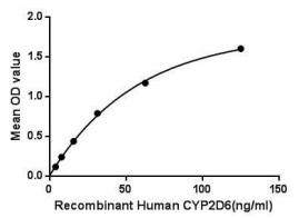 | Bio-activity : | Cytochrome P450 2D6 (CYP2D6), a member of the cytochrome P450 mixed-function oxidase system, is one of the most important enzymes involved in the metabolism of xenobiotics in the body. In particular, CYP2D6 is responsible for the metabolism and elimination of approximately 25% of clinically used drugs, via the addition or removal of certain functional groups-specifically, hydroxylation, demethylation, and dealkylation. CYP2D6 is primarily expressed in the liver. It is also highly expressed in areas of the central nervous system, including the substantia nigra. This enzyme also metabolizes several endogenous substances, such as hydroxytryptamines, neurosteroids, and both m-tyramine and p-tyramine which CYP2D6 metabolizes into dopamine in the brain and liver. Besides, Cytochrome P450 Reductase (CPR) has been identified as an interactor of CYP2D6, thus a binding ELISA assay was conducted to detect the interaction of recombinant human VDR and recombinant human CPR. Briefly, CYP2D6 were diluted serially in PBS, with 0.01% BSA (pH 7.4). Duplicate samples of 100uL were then transferred to CPR-coated microtiter wells and incubated for 2h at 37°C. Wells were washed with PBST and incubated for 1h with anti-CYP2D6 pAb, then aspirated and washed 3 times. After incubation with HRP labelled secondary antibody, wells were aspirated and washed 3 times. With the addition of substrate solution, wells were incubated 15-25 minutes at 37°C. Finally, add 50µL stop solution to the wells and read at 450nm immediately. The binding activity of CYP2D6 and CPR was shown, and this effect was in a dose dependent manner. |