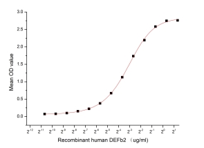 Defensin Beta 2 (DEFb2) is a 7 kDa secreted protein. It exhibits antimicrobial activity against Gram-negative bacteria and Gram-positive bacteria, with highest activity against Gram-negative bacteria. Antimicrobial activity against P.aruginosa seems to be salt-sensitive and is reduced with high salt concentrations greater than 25 mM. The human DEFb2 cDNA encodes a 64 aa protein with a 23 aa signal sequence and a 41 aa mature sequence. Besides, Toll Like Receptor 4 (TLR4) has been identified as an interactor of DEFb2, thus a binding ELISA assay was conducted to detect the interaction of recombinant human DEFb2 and recombinant human TLR4. Briefly, DEFb2 was diluted serially in PBS with 0.01% BSA (pH 7.4). Duplicate samples of 100μl were then transferred to TLR4-coated microtiter wells and incubated for 1h at 37°C. Wells were washed with PBST and incubated for 1h with anti-DEFb2 pAb, then aspirated and washed 3 times. After incubation with HRP labelled secondary antibody for 1h at 37°C, wells were aspirated and washed 5 times. With the addition of substrate solution, wells were incubated 15-25 minutes at 37°C. Finally, add 50µL stop solution to the wells and read at 450/630nm immediately. The binding activity of DEFb2 and TLR4 was shown, the EC50 for this effect is 0.11 ug/mL. |