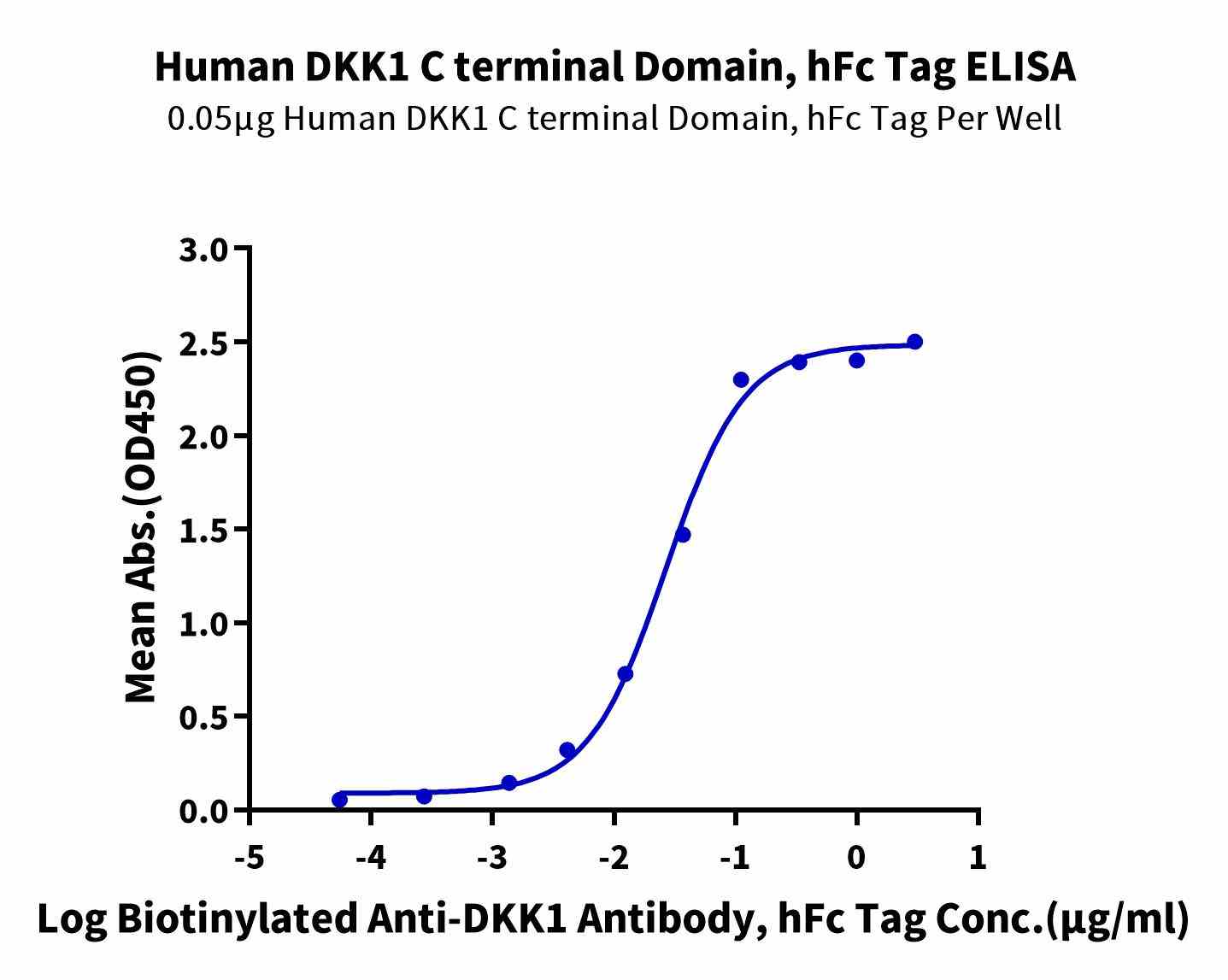 | Bio-activity : | Immobilized Human DKK1 C terminal Domain, hFc Tag at 0.5μg/ml (100μl/Well) on the plate. Dose response curve for Biotinylated Anti-DKK1 Antibody, hFc Tag with the EC50 of 26.7ng/ml determined by ELISA. |