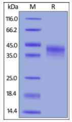 Molecular Mass : | The protein has a calculated MW of 25.8 kDa. The protein migrates as 35-45 kDa under reducing (R) condition (SDS-PAGE) due to glycosylation. |