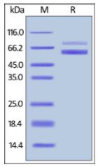 Molecular Mass : | The protein has a calculated MW of 75.0 kDa. The protein migrates as 50-60 kDa and 70-80 kDa under reducing (R) condition (SDS-PAGE) due to glycosylation. |
