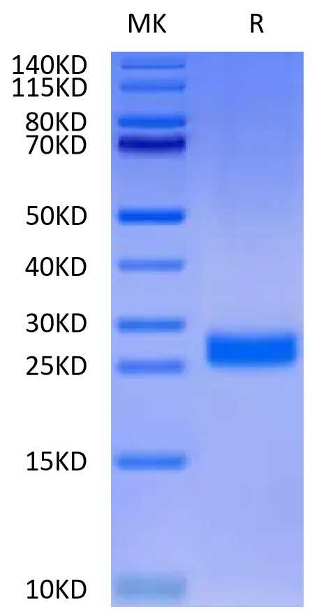 | Molecular Mass : | The protein has a predicted MW of 21.20 kDa. Due to glycosylation, the protein migrates to 25-30 kDa based on Tris-Bis PAGE result. |