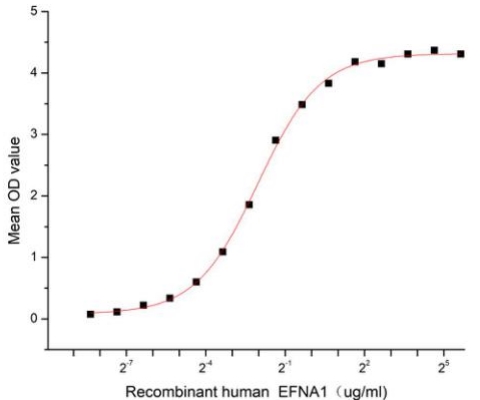 | Bio-activity : | Ephrin-A1 (EFNA1), also known as EPLG1, LERK1, TNFAIP4, Immediate early response protein B61, is a member of the A-type ephrin family of cell surface proteins that function as ligands for the A-type Eph receptor tyrosine kinase family. EFNA1 plays an important role in angiogenesis and tumor neovascularization. EFNA1 widely affects tumor growth through enhancing tumor angiogenesis, malignant cell events and invasiveness. Ephrin Type A Receptor 1 (EPHA1) is one of high-affinity ligands for EFNA1, thus a functional binding ELISA assay was conducted to detect the interaction of recombinant human EFNA1 and recombinant mouse EPHA1. Briefly, biotin-linked EFNA1 were diluted serially in PBS, with 0.01% BSA (pH 7.4). Duplicate samples of 100 ul were then transferred to EPHA1-coated microtiter wells and incubated for 1h at 37°C. Wells were washed with PBST 3 times and incubation with Streptavidin-HRP for 30min, then wells were aspirated and washed 5 times. With the addition of substrate solution, wells were incubated 15-25 minutes at 37°C. Finally, add 50 µl stop solution to the wells and read at 450 nm immediately. The binding activity of recombinant human EFNA1 and recombinant mouse EPHA1 was shown, the EC50 for this effect is 0.24 ug/mL. |