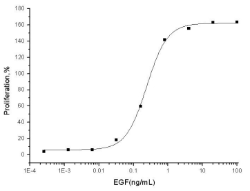 | Bio-activity : | Epidermal growth factor (EGF) is a growth factor that stimulates cell growth, proliferation, and differentiation by binding to its receptor EGFR. To test the effect of EGF on cell proliferation of 3T3 fibroblasts, 3T3 cells were seeded into triplicate wells of 96-well plates at a density of 2, 000cells/well and allowed to attach overnight, then the medium was replaced with serum-free standard DMEM prior to the addition of various concentrations of EGF. After incubated for 72h, cells were observed by inverted microscope and cell proliferation was measured by Cell Counting Kit-8 (CCK-8). Briefly, 10µL of CCK-8 solution was added to each well of the plate, then measure the absorbance at 450nm using a microplate reader after incubating the plate for 1-4 hours at 37°C. |