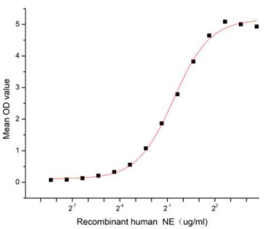 | Bio-activity : | Neutrophil elastase (NE), also known as polymorphonuclear leukocyte elastase, is a major protease in the primary granules of neutrophils, is involved in microbicidal activity. It is located primarily in the azurophil granules of polymorphonuclear leukocytes. NE is an important factor promoting inflammation, has bactericidal effects, and shortens the inflammatory process. NE also regulates tumor growth by promoting metastasis and tumor microenvironment remodeling. However, NE plays a role in killing tumors under certain conditions and promotes other diseases such as pulmonary ventilation dysfunction. Additionally, it plays a complex role in various physiological processes and mediates several diseases. Myeloperoxidase (MPO) has been identified as an interactor of NE, thus a functional binding ELISA assay was conducted to detect the interaction of recombinant human NE and recombinant rat MPO. Briefly, biotin-linked NE were diluted serially in PBS, with 0.01% BSA (pH 7.4). Duplicate samples of 100 μl were then transferred to MPO-coated microtiter wells and incubated for 1h at 37°C. Wells were washed with PBST 3 times and incubation with Streptavidin-HRP for 30min, then wells were aspirated and washed 5 times. With the addition of substrate solution, wells were incubated 15-25 minutes at 37°C. Finally, add 50 µl stop solution to the wells and read at 450 nm immediately. The binding activity of recombinant human NE and recombinant rat MPO was shown, the EC50 for this effect is 0.66 ug/mL. |