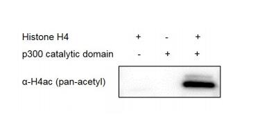 0.5 μg Histone H4 was incubated with 0 μg (-), 0.5 μg (+) p300 protein, catalytic domain in 20 μL reaction system containing 50 mM Tris-HCl pH 8.0, 0.1 mM EDTA, 50 ng/μL BSA, 1 mM TCEP and 20 μM Acetyl-CoA for 2 hours at room temperature. Half of each reaction was run on a 13% SDS-PAGE gel, and products were detected by Western blot. H4ac (pan-acetyl) antibody was used to recognize acetylated histone H4. |