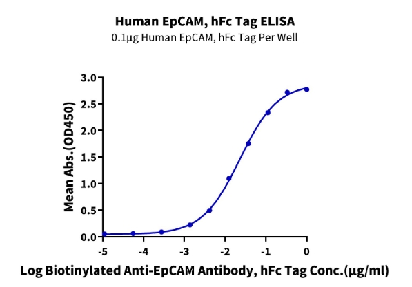 | Bio-activity : | Immobilized Human EpCAM, hFc Tag at 1μg/ml (100μl/well) on the plate. Dose response curve for Biotinylated Anti-EpCAM Antibody, hFc Tag with the EC50 of 23.0ng/ml determined by ELISA. |