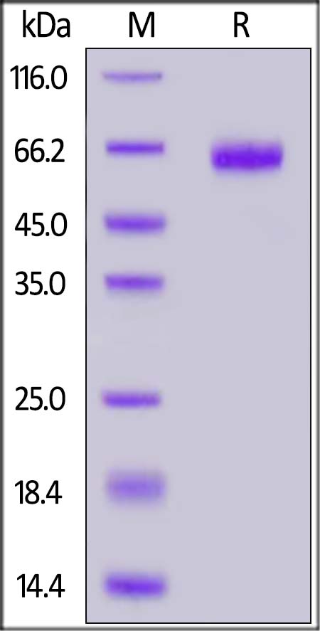| Molecular Mass : | This protein carries a mouse IgG2a Fc tag at the C-terminus.The protein has a calculated MW of 54.3 kDa. The protein migrates as 60-65 kDa under reducing (R) condition (SDS-PAGE) due to glycosylation. |