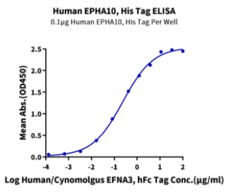 | Bio-activity : | Immobilized Human EPHA10, His Tag at 1ug/ml (100ul/well) on the plate. Dose response curve for Human/Cynomolgus EFNA3, hFc Tag with the EC50 of 0.24ug/ml determined by ELISA. |