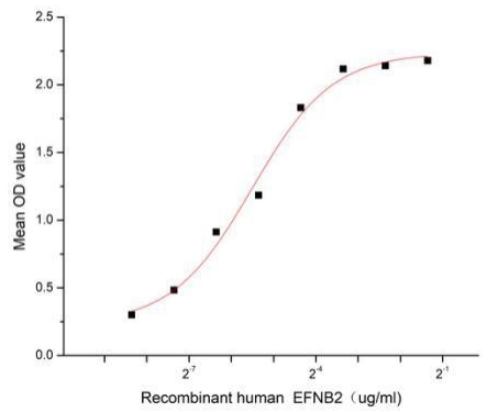 | Bio-activity : | EphrinB2 (EFNB2), a 40 kDa member of the EphrinB family, is a pivotal bidirectional signaling molecule ubiquitously expressed in mammals and is crucial in angiogenesis during development and disease progression. Besides, EFNB2 is expressed at abnormally high levels in some neoplasms, such as squamous cell carcinoma of the head and neck and colorectal cancer. Its overexpression is associated with the malignant progression of tumors. Reelin (RELN) has been identified as an interactor of EFNB2, thus a functional binding ELISA assay was conducted to detect the interaction of recombinant human EFNB2 and recombinant human RELN. Briefly, EFNB2 was diluted serially in PBS with 0.01% BSA (pH 7.4). Duplicate samples of 100 μl were then transferred to RELN-coated microtiter wells and incubated for 1h at 37°C. Wells were washed with PBST and incubated for 1h with anti-EFNB2 pAb, then aspirated and washed 3 times. After incubation with HRP labelled secondary antibody for 1h at 37°C, wells were aspirated and washed 5 times. With the addition of substrate solution, wells were incubated 15-25 minutes at 37°C. Finally, add 50 µL stop solution to the wells and read at 450/630 nm immediately. The binding activity of recombinant human EFNB2 and recombinant human RELN was shown, the EC50 for this effect is 0.02 ug/mL. |