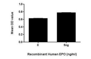 Erythropoietin (EPO), also known as hematopoietin or hemopoietin, is a glycoprotein cytokine secreted by the kidney in response to cellular hypoxia; it stimulates red blood cell production (erythropoiesis) in the bone marrow. Erythropoietin is an essential hormone for red blood cell production. EPO can cooperate with various other growth factors involved in the development of erythroid lineage from multipotent progenitors. To test the effect of EPO on cell proliferation, TF-1 cells were seeded into triplicate wells of 96-well plates at a density of 5,000 cells/well with 1% serum standard 1640 including various concentrations of recombinant human EPO. After incubated for 72h, cells were observed by inverted microscope and cell proliferation was measured by Cell Counting Kit-8 (CCK-8). Briefly, 10µL of CCK-8 solution was added to each well of the plate, then the absorbance at 450nm was measured using a microplate reader after incubating the plate for 1-4 hours at 37°C. Proliferation of TF-1 cells after incubation with EPO for 72h observed by inverted microscope was shown. Cell viability was assessed by CCK-8 (Cell Counting Kit-8 ) assay after incubation with recombinant EPO for 72h. EPO significantly increased cell viability of TF-1 cells. |