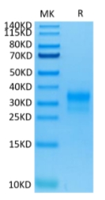 Molecular Mass : | The protein has a predicted MW of 18.5 kDa. Due to glycosylation, the protein migrates to 28-40 kDa based on Tris-Bis PAGE result. |