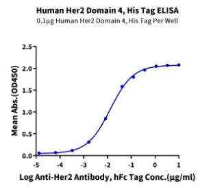 | Bio-activity : | Immobilized Human Her2 Domain 4, His Tag at 1ug/ml (100ul/well) on the plate. Dose response curve for Anti-Her2 Antibody, hFc Tag with the EC50 of 13.1ng/ml determined by ELISA. |