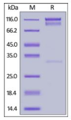 | Molecular Mass : | The protein has a calculated MW of 96 kDa. The protein migrates as 122-132 kDa under reducing (R) condition (SDS-PAGE) due to glycosylation. |