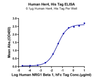 | Bio-activity : | Immobilized Human Her4 at 1μg/ml (100μl/well) on the plate. Dose response curve for Human NRG1 Beta 1, hFc Tag with the EC50 of 34.7ng/ml determined by ELISA. |