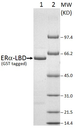 Product Overview : Recombinant Human GST-tagged Estrogen receptor alpha ligand-binding domain (ERα-LBD) consists of a 218 a.a. GST tag, a 30 a.a. flexible linker and a 346 a.a. ERα-LBD, Acc# NP_000116 amino acids 250-595, was expressed in baculovirus-infected insect cells and purified using affinity chromatography.