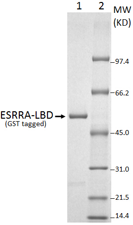 | Product Overview : | Recombinant Human GST-tagged Estrogen-related receptor alpha ligand-binding domain (ESRRA-LBD) consists of a 218 a.a. GST tag, a 13 a.a. flexible linker and a 244 a.a. ESRRA-LBD, Acc# AAH92470.1, amino acids 180-423, was expressed in baculovirus-infected insect cells and purified using affinity chromatography. |