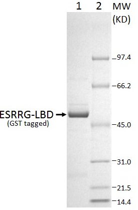 | Product Overview : | Recombinant Human GST-tagged Estrogen-related receptor gamma ligand-binding domain (ESRRG-LBD) consists of a 218 a.a. GST tag, a 15 a.a. flexible linker and a 224 a.a. ESRRG-LBD, Acc# NP_001429, amino acids 235-458, was expressed in baculovirus-infected insect cells and purified using affinity chromatography. |