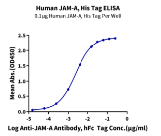 | Bio-activity : | Immobilized Human JAM-A, His Tag at 1ug/ml (100ul/Well) on the plate. Dose response curve for Anti-JAM-A Antibody, hFc Tag with the EC50 of 2.4ng/ml determined by ELISA. |