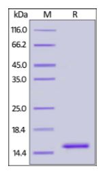 | Molecular Mass : | This protein carries a polyhistidine tag at the N-terminus.The protein has a calculated MW of 15.3 kDa. The protein migrates as 15 kDa under reducing (R) condition (SDS-PAGE). |