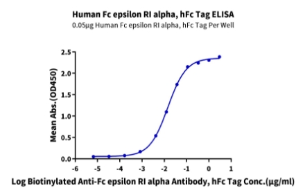 | Bio-activity : | Immobilized Human Fc epsilon RI alpha, hFc Tag at 0.5ug/ml (100ul/Well) on the plate. Dose response curve for Biotinylated Anti-Fc epsilon RI alpha Antibody, hFc Tag with the EC50 14.5ng/ml determined by ELISA. |
