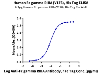| Bio-activity : | Immobilized Human Fc gamma RIIIA (V176), His Tag at 2μg/ml (100μl/Well) on the plate. Dose response curve for Anti-Fc gamma RIIIA Antibody, hFc Tag with the EC50 of 9.1ng/ml determined by ELISA. |