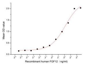 | Bio-activity : | Fibroblast Growth Factor 12 (FGF12) is a member of the fibroblast growth factor (FGF) family. FGF family members possess broad mitogenic and cell survival activities, and are involved in a variety of biological processes, including embryonic development, cell growth, morphogenesis, tissue repair, tumor growth, and invasion. Fibroblast Growth Factor 12 (FGF12) may represent an important modulator of neuronal network activity and has been associated with developmental and epileptic encephalopathy (DEE). Besides, it is reported that both domains of (Ca2 )4-CaM directly bind two sites in the N-terminal domain (NTD) of A-type FGF splice variants (FGF11A, FGF12A, FGF13A, and FGF14A) with high affinity. Calmodulin 1 (CALM1) has been identified as an interactor of FGF12, thus a binding ELISA assay was conducted to detect the interaction of recombinant human FGF12 and recombinant human CALM1. Briefly, FGF12 was diluted serially in PBS with 0.01% BSA (pH 7.4). Duplicate samples of 100 μl were then transferred to CALM1-coated microtiter wells and incubated for 1h at 37°C. Wells were washed with PBST and incubated for 1h with anti-FGF12 pAb, then aspirated and washed 3 times. After incubation with HRP labelled secondary antibody for 1h at 37°C, wells were aspirated and washed 5 times. With the addition of substrate solution, wells were incubated 15-25 minutes at 37°C. Finally, add 50 µL stop solution to the wells and read at 450/630nm immediately. The binding activity of recombinant human FGF12 and recombinant human CALM1 was shown, the EC50 for this effect is 4.44 ug/mL. |