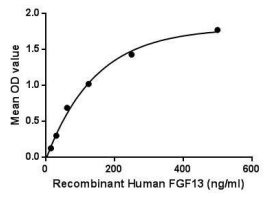 | Bio-activity : | Fibroblast growth factor 13 (FGF13) is a member of the fibroblast growth factor (FGF) family. FGF family members possess broad mitogenic and cell survival activities, and are involved in a variety of biological processes, including embryonic development, cell growth, morphogenesis, tissue repair, tumor growth, and invasion. Besides, Prion Protein (PRNP) has been identified as an interactor of FGF13, thus a binding ELISA assay was conducted to detect the interaction of recombinant human FGF13 and recombinant human PRNP. Briefly, FGF13 were diluted serially in PBS, with 0.01% BSA (pH 7.4). Duplicate samples of 100μL were then transferred to PRNP-coated microtiter wells and incubated for 2h at 37°C. Wells were washed with PBST and incubated for 1h with anti-FGF13 pAb, then aspirated and washed 3 times. After incubation with HRP labelled secondary antibody, wells were aspirated and washed 3 times. With the addition of substrate solution, wells were incubated 15-25 minutes at 37°C. Finally, add 50µL stop solution to the wells and read at 450nm immediately. The binding activity of FGF13 and PRNP was shown, and this effect was in a dose dependent manner. |