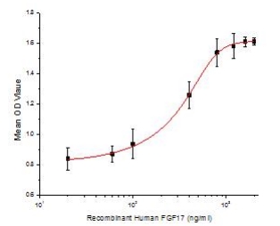 | Bio-activity : | Fibroblast growth factor 17(FGF17) is a member of the fibroblast growth factorfamily. FGF family members possess broad mitogenicand cell survival activities and are involved in a varietyof biological processes, including embryonicdevelopment cell growth, morphogenesis, tissue repair, tumor growth, andinvasion. A proliferation assay was conducted to detect the bioactivity of recombinant human FGF17 using Balb/c 3T3 cells. Briefly, 3T3 cells were seeded into triplicate wells of 96-well plates at a density of 4,000 cells/well and allowed to attach overnight, then the medium was replaced with various concentrations of FGF17 diluted with serum-free standard DMEM. After incubated for 48h, cells were observed by inverted microscope and cell proliferation was measured by Cell Counting Kit-8(CCK-8). Briefly, 10 µl of CCK-8 solution was added to each well of the plate, then the absorbance at 450 nm was measured using a microplate reader after incubating the plate for 1-4 hours at 37°C. Proliferation of Balb/c 3T3 cells after incubation with FGF17 for 48h observed by inverted microscope was shown. Cell viability was assessed by CCK-8(Cell Counting Kit-8 ) assay after incubation with recombinant FGF17 for 48h. It was obvious that FGF17 significantly increased cell viability of 3T3 cells. The ED50 of recombinant human FGF17 is 335ng/ml. |