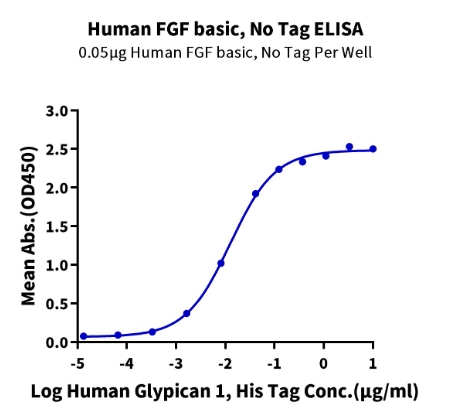 | Bio-activity : | Immobilized Human FGF basic at 0.5 μg/ml (100 μl/Well) on the plate. Dose response curve for Human Glypican 1, His Tag with the EC50 of 12.6 ng/ml determined by ELISA. |
