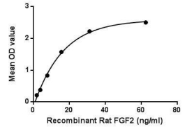 | Bio-activity : | Basic fibroblast growth factor (FGF2), also known as bFGF, FGF-β is a member of a large family of structurally related heparin-binding proteins (the FGFs) involved in the regulation of cell proliferation, growth and differentiation. It involved in many biological processes including angiogenesis, embryonic development andwoundhealing. Additionally, FGF2 is a critical component of human embryonic stem cell culture medium. Besides, Caspase 1 (CASP1) has been identified as aninteractorof FGF2, thus a binding ELISA assay was conducted to detect the interaction of recombinant rat FGF2 and recombinant rat CASP1. Briefly, FGF2 were diluted serially in PBS, with 0.01% BSA (pH 7.4). Duplicate samples of 100uL werethen transferred to CASP1-coated microtiter wells and incubated for 2h at 37°C. Wells were washed with PBST and incubated for 1h with anti-FGF2 pAb, then aspirated and washed 3 times. After incubation with HRP labelled secondary antibody, wells were aspirated and washed 3 times. With the addition of substrate solution, wells were incubated 15-25 minutes at 37°C. Finally, add 50µL stop solution to the wells and read at 450nm immediately. The binding activity of FGF2 and CASP1wasshown, and this effect was in a dose dependent manner. |