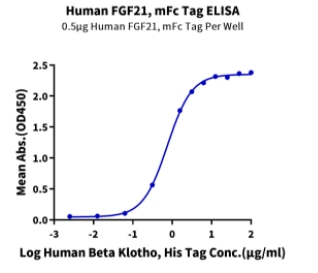 | Bio-activity : | Immobilized Human FGF21 at 5ug/ml (100ul/Well) on the plate. Dose response curve for Human Beta Klotho, His Tag with the EC50 of 0.75ug/ml determined by ELISA. |