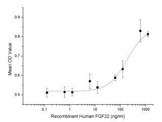 FGF22(Fibroblast growth factor 22) is a member of the fibroblast growth factor (FGF) family. FGF family members possess broad mitogenic and cell survival activities and are involved in a variety of biological processes including embryonic development, cell growth, morphogenesis, tissue repair, tumor growth and invasion. A proliferation assay was conducted to detect the bioactivity of recombinant human FGF22 using Balb/c 3T3 cells. Briefly, 3T3 cells were seeded into triplicate wells of 96-well plates at a density of 4,000 cells/well and allowed to attach overnight, then the medium was replaced with various concentrations of FGF22 diluted with serum-free standard DMEM. After incubated for 48h, cells were observed by inverted microscope and cell proliferation was measured by Cell Counting Kit-8(CCK-8). Briefly, 10 µl of CCK-8 solution was added to each well of the plate, then the absorbance at 450 nm was measured using a microplate reader after incubating the plate for 1-4 hours at 37°C. Proliferation of Balb/c 3T3 cells after incubation with FGF22 for 48h observed by inverted microscope was shown. Cell viability was assessed by CCK-8(Cell Counting Kit-8 ) assay after incubation with recombinant FGF22 for 48h. It was obvious that FGF22 significantly increased cell viability of 3T3 cells. The ED50 of recombinant human FGF22 is 187ng/ml. |