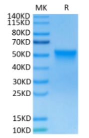 Molecular Mass : | The protein has a predicted MW of 30.1 kDa. Due to glycosylation, the protein migrates to 50-60 kDa based on Tris-Bis PAGE result. |