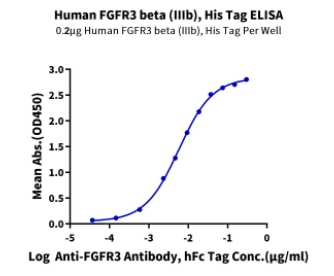 | Bio-activity : | Immobilized Human FGFR3 beta (IIIb), His Tag at 2ug/ml (100ul/well) on the plate. Dose response curve for Anti-FGFR3 Antibody, hFc Tag with the EC50 of 5.8ng/ml determined by ELISA. |
