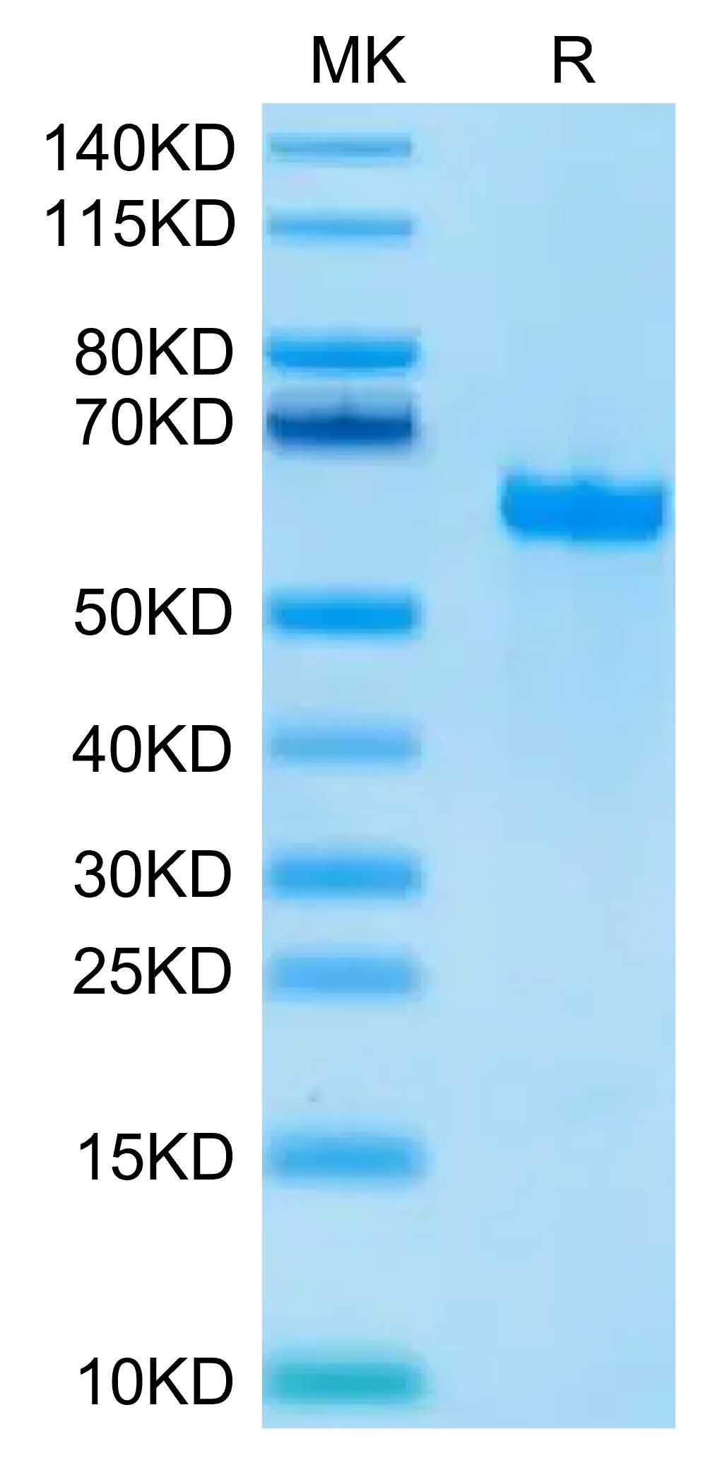 | Molecular Mass : | The protein has a predicted MW of 54.8 kDa. Due to glycosylation, the protein migrates to 60-66 kDa based on Tris-Bis PAGE result. |